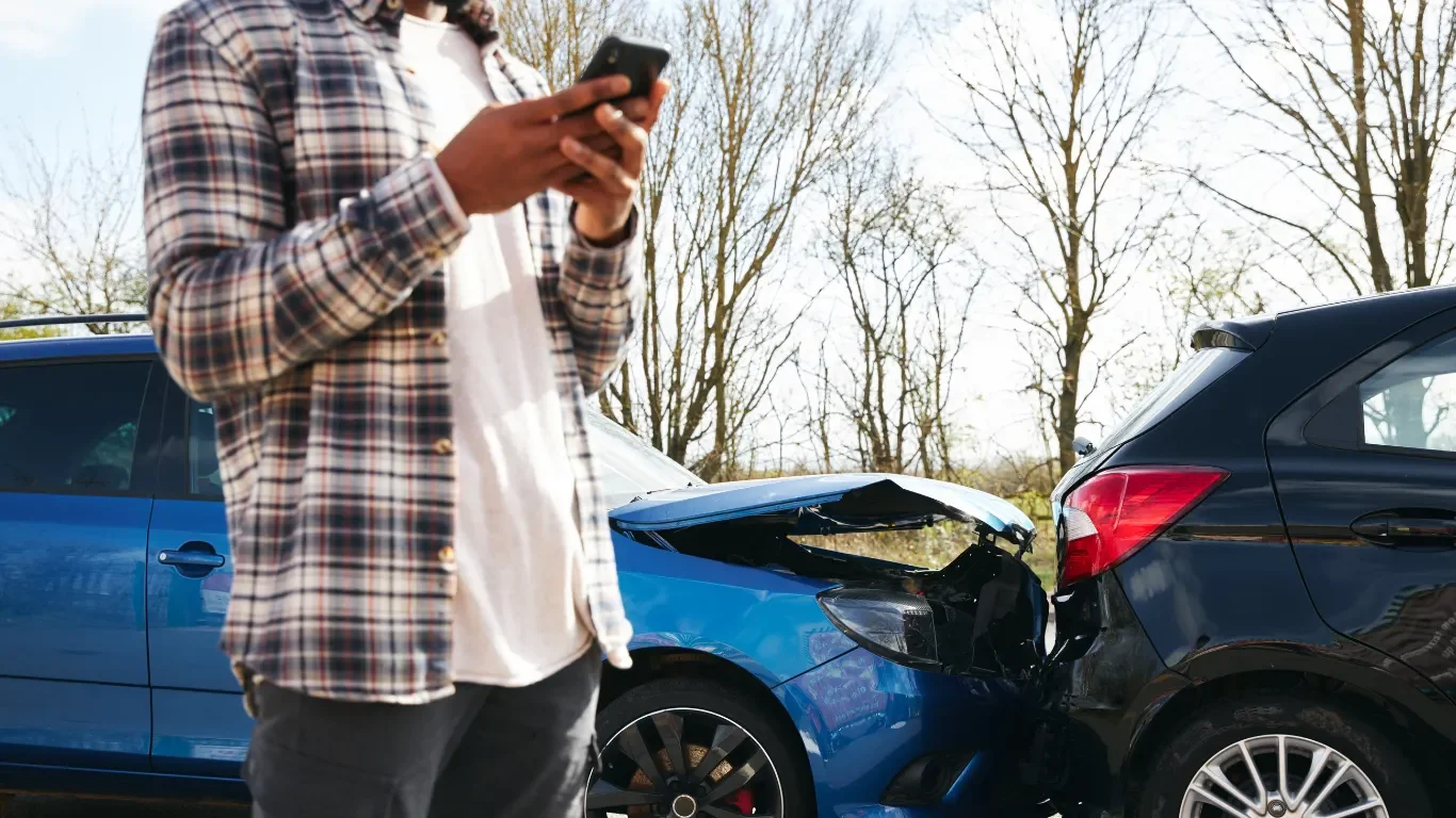 A person using a phone at the scene of a rear-end collision, with visible damage to both vehicles. The image reflects the uncertainty many people face after an accident when deciding whether legal guidance is needed, even if the crash was not their fault.