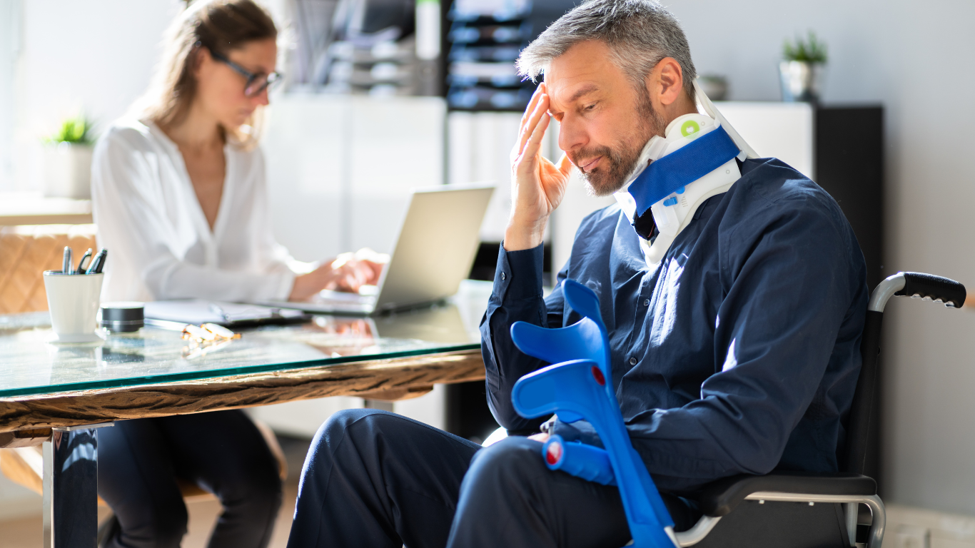 The image shows a man in a wheelchair, visibly distressed, with a neck brace and crutches, symbolizing the hidden toll of delayed injuries that can surface after a car accident.